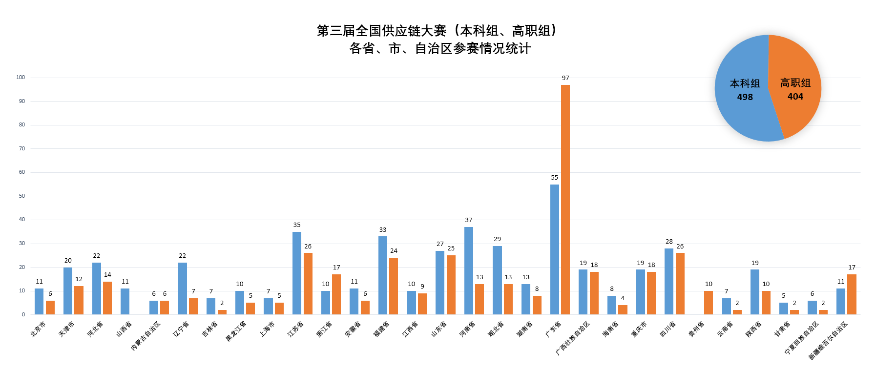 本次本科组、高职组比赛主要面向全国本科院校、职业院校物流与供应链专业学生,涉及供应链运营实战和供应链规划实战两个赛项,共有来自全国29个省、市、自治区的496所院校的902支队伍(本科组498、高职组404)报名参赛。易木科技作为64体育的技术支持单位,以过硬的技术实力和高效的服务响应,有力保障了大赛的顺利进行!