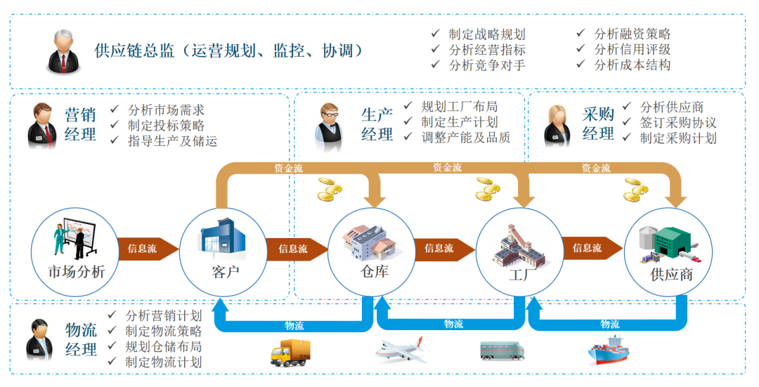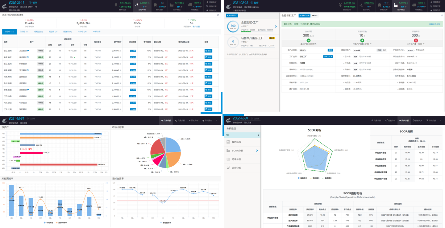 平台以企业案例为背景,以人才培养为导向,紧密结合“资金流、信息流、物流”三流合一的供应链特性,真实再现供应链运营的业务场景,通过经营指标分析、网络规划分析、scor分析等各种具有供应链特征的图表为竞赛和教学提供数据支撑,实现三位一体的供应链人才培养目标。