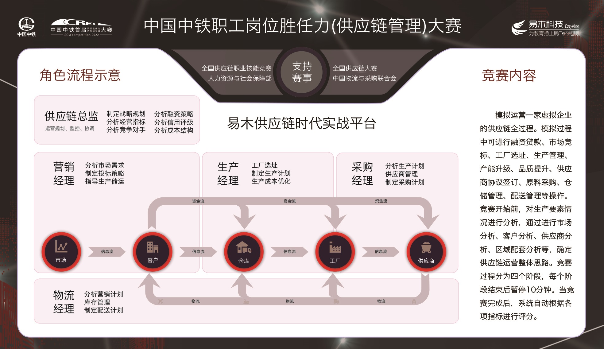 本次比赛紧扣“提高意识、营造氛围、塑造文化,提升能力”目标,主要通过全国供应链管理职业技能竞赛所使用的【易木供应链时代实战平台】进行。