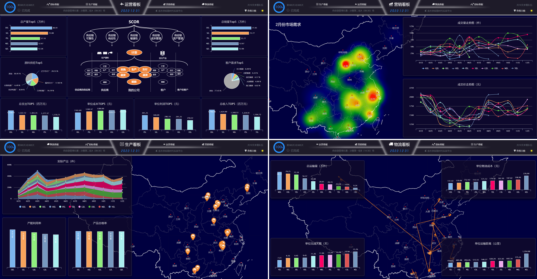 竞赛平台以企业案例为背景,以人才培养为导向,紧密结合“资金流、信息流、物流”三流合一的供应链特性,真实再现供应链运营的业务场景,通过经营指标分析、网络规划分析、scor分析等各种具有供应链特征的图表为学习和竞赛提供数据支撑,实现供应链人才培养的目标。